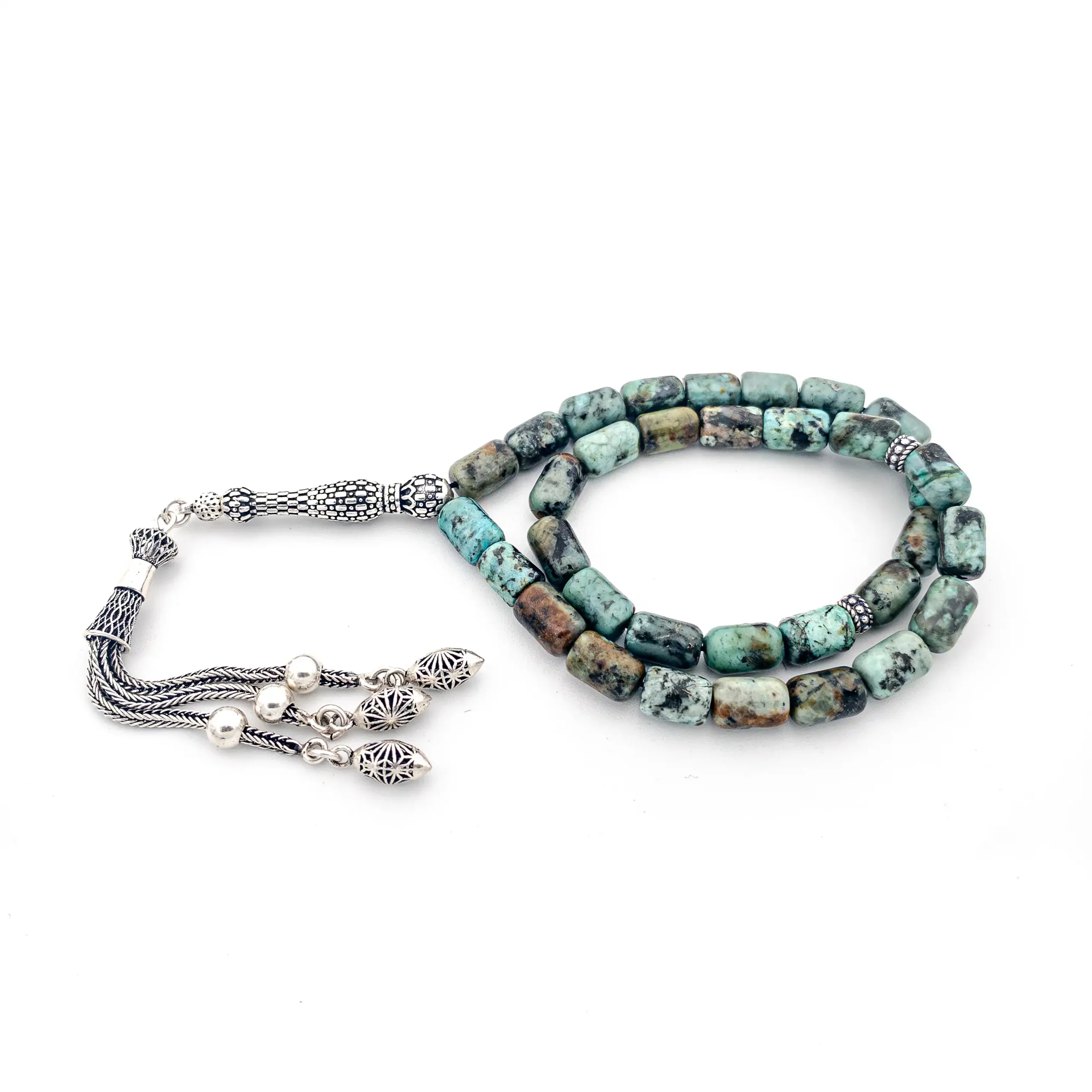 Afrika Turkuazı, yeşil ve toprak tonlarının benzersiz birleşimiyle dikkat çeker. Taşın yüzeyindeki doğal desenler her bir taneyi kendine özgü kılar. 925 ayar gümüş imameyle tamamlanan bu tesbih, atölyede özenle hazırlanmıştır ve dengeli renk geçişleriyle sade bir zarafet sunar.