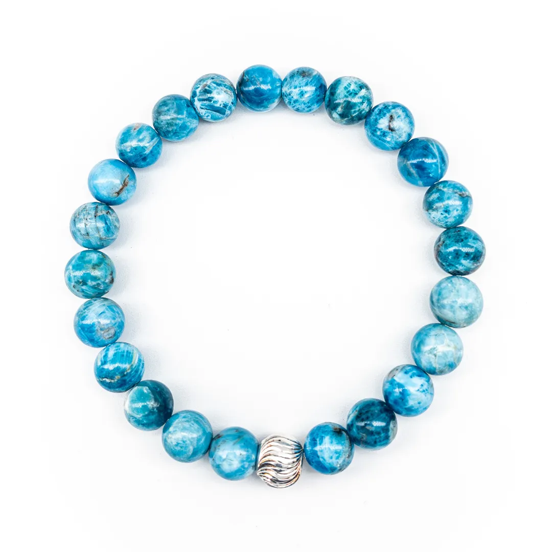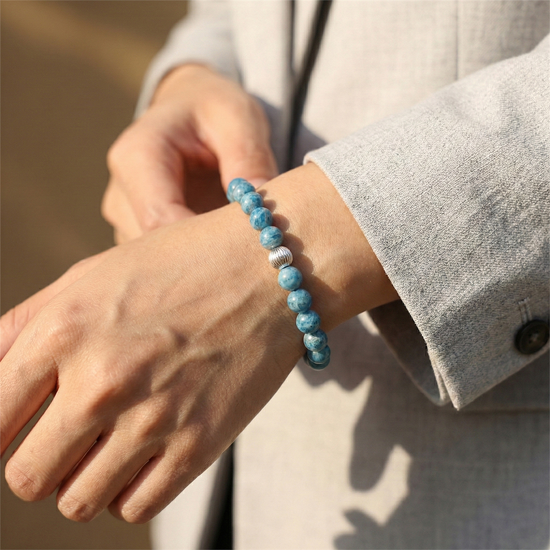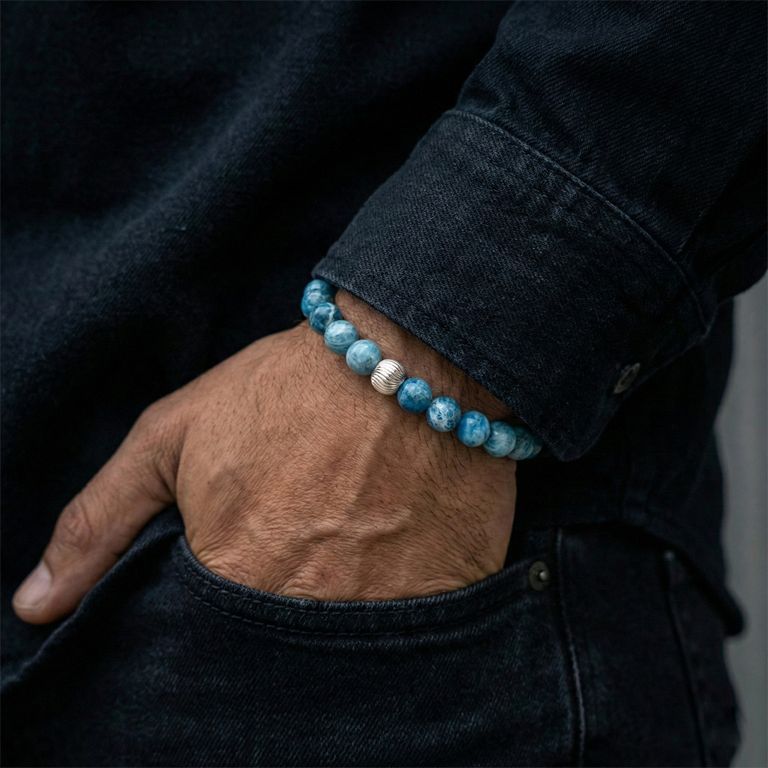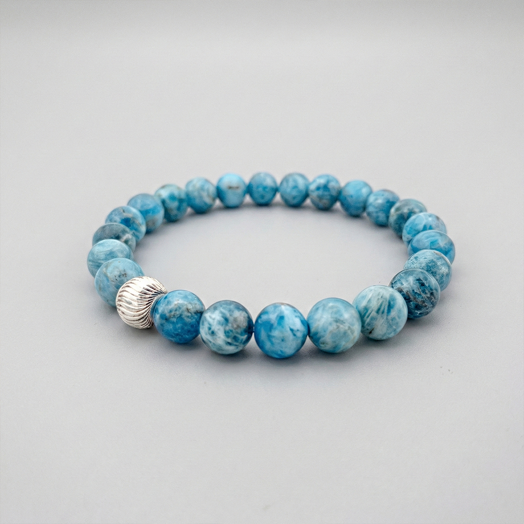Apatit, fosfat mineralleri grubundandır ve parlak mavi-yeşil tonlarıyla bilinir. Yarı saydam yapısı ışık altında derinlik hissi verir.