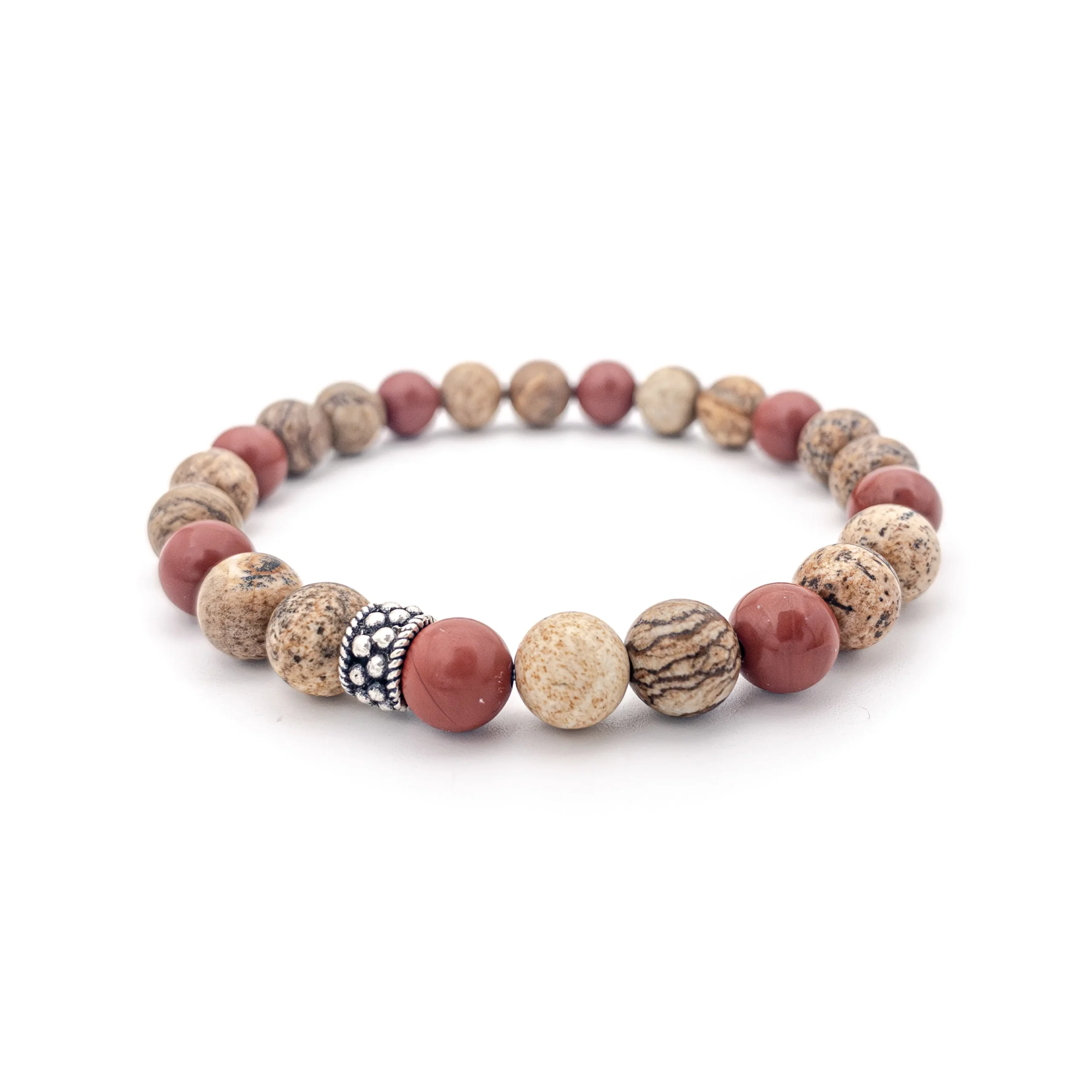Jasper, kuvars grubuna ait doğal bir taştır; kahverengi ve kırmızı tonlarıyla toprakla güçlü bir bağ kurar. Mat ve doğal dokusu, her bileklikte farklı bir karakter taşır.