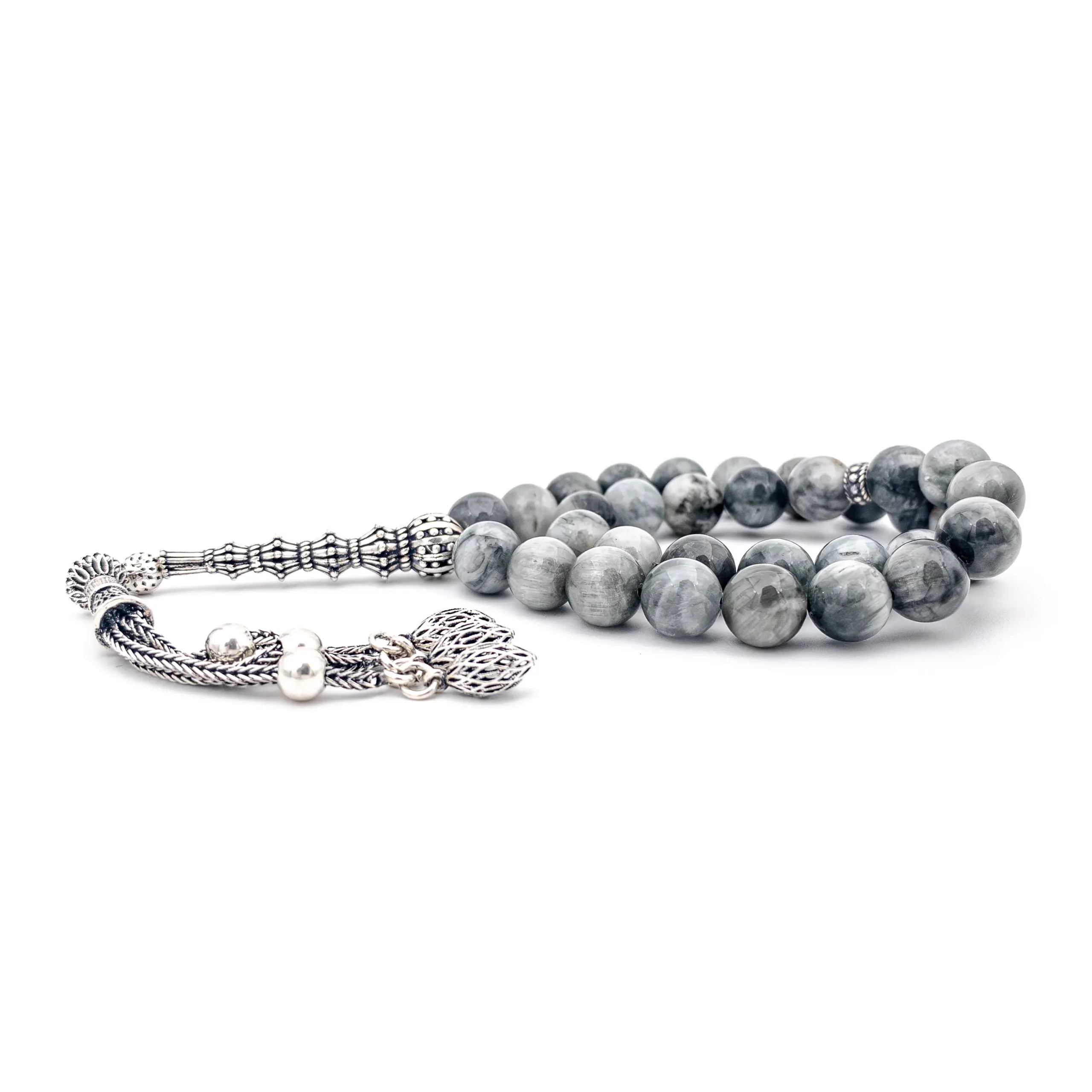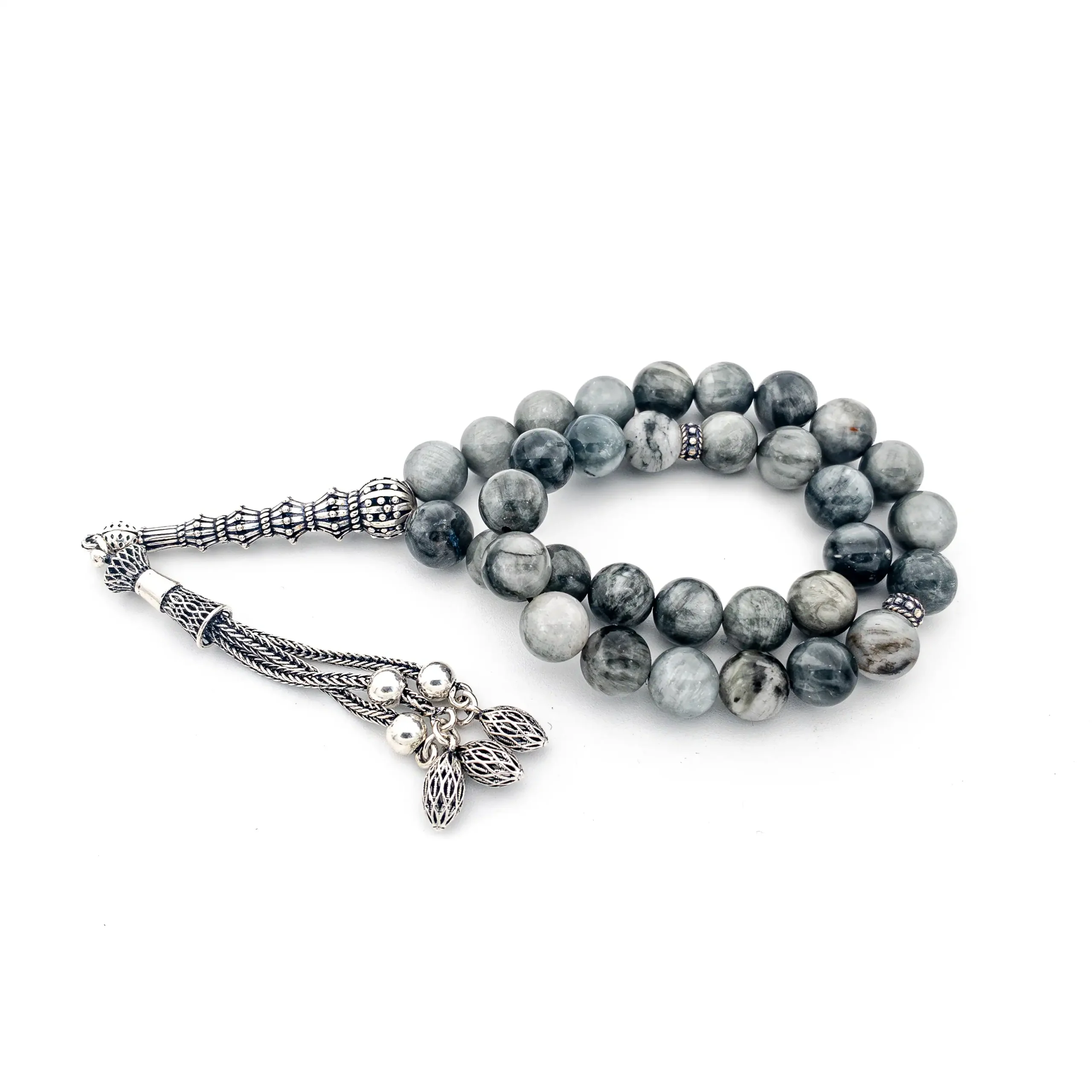 Doğal Kartal Gözü taşlarından üretilmiş, 925 ayar gümüş imameye sahip tesbih.