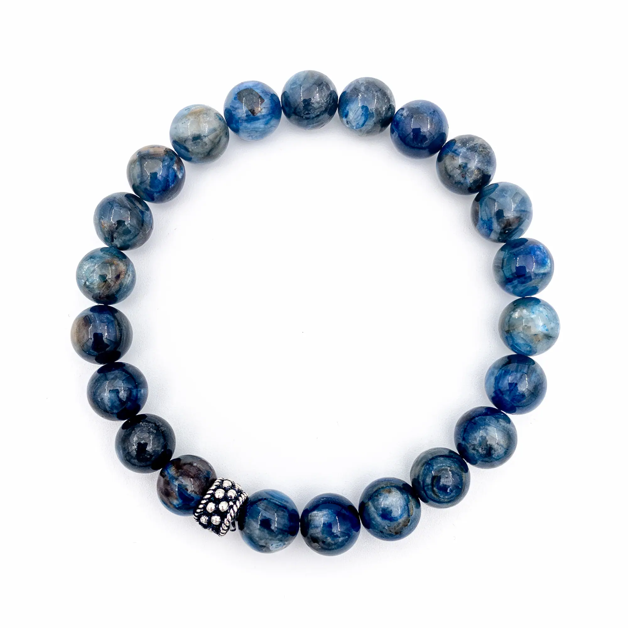 Okyanusun ve Gökyüzünün Derin Gücü: Bileğinizdeki Eşsiz İmza Doğanın kalbinden, milyonlarca yıllık kristalleşme sürecinin ve yer kabuğunun gizemli hareketlerinin eseri… Kyanitin o sıradan, fabrikasyon taşlardan farklı olan, karakteristik katmanlı ve derin mavi haliyle tanışın. Alışılmışın aksine, bu tasarımda taşın o doğal, ışığı kıran buzlu ve çizgili dokusunu özellikle ön plana çıkardık. Her bir boncuğun üzerindeki o eşsiz gece mavisi, buz beyazı ve lacivert tonlarındaki geçişler, stilinize asil, net ve güçlü bir karakter katar.