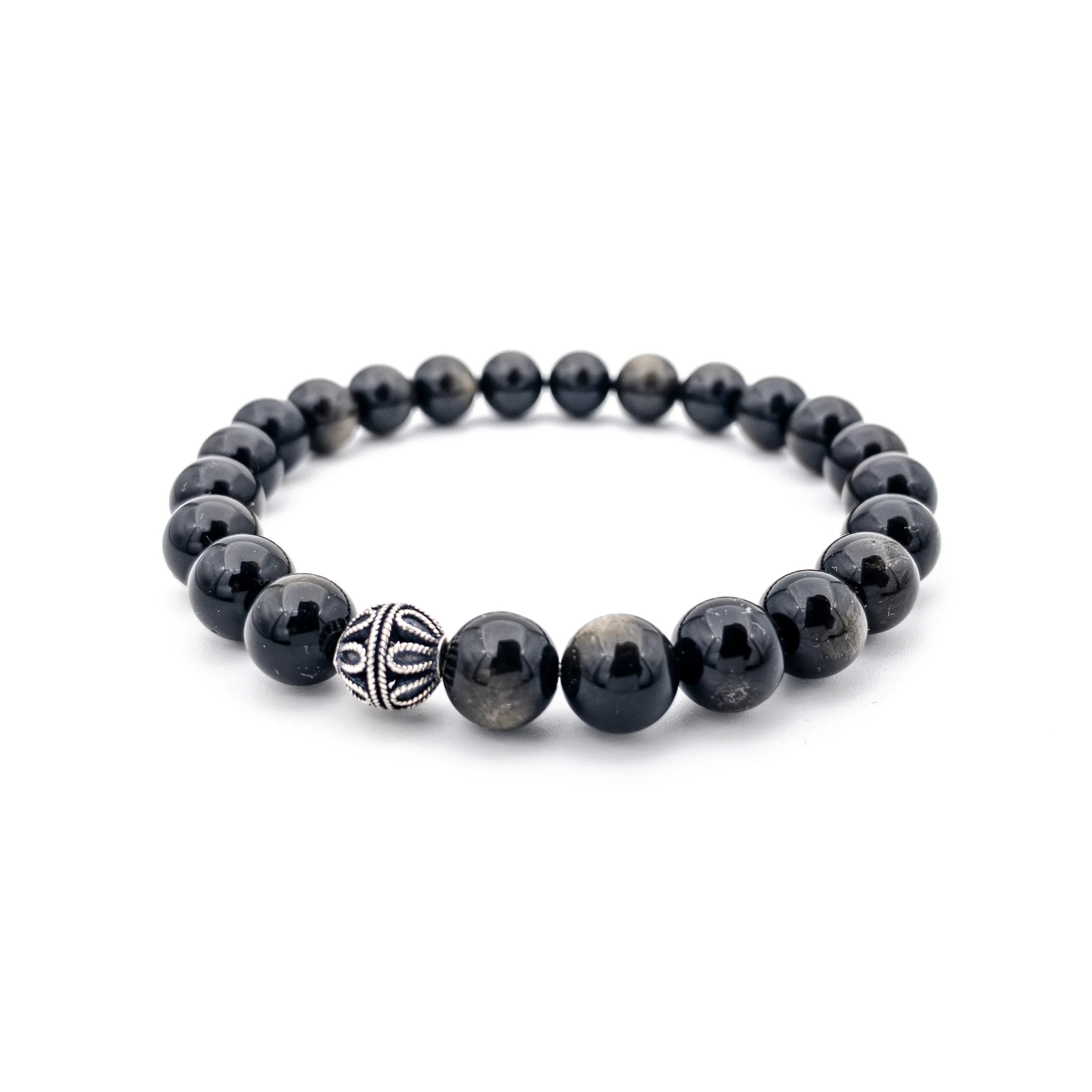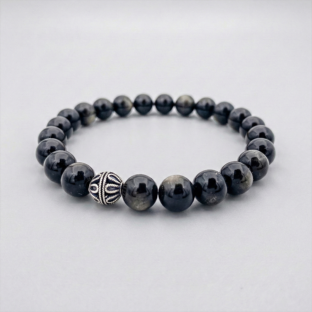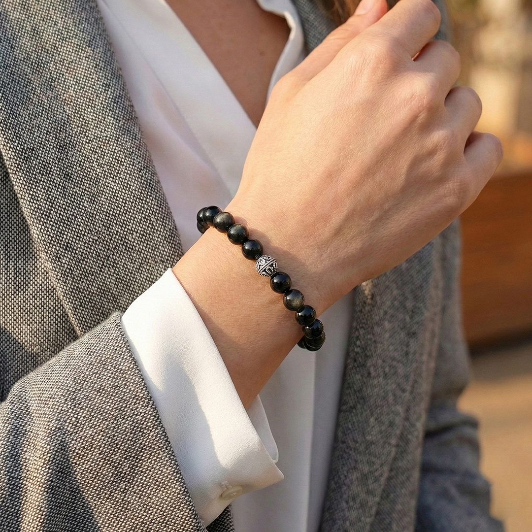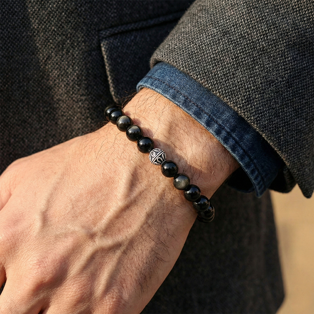 Volkanik lavların hızla soğumasıyla oluşan ve “Volkanik Cam” olarak da bilinen Obsidyen, derin siyah tonu ve doğal camsı parlaklığıyla stilinize güçlü bir duruş katmak için tasarlandı. Standart mat taşların aksine; ışığı yansıtan o pürüzsüz yüzeyi ve gizemli siyah dokusu, bu bilekliği modern ve sofistike kılar.