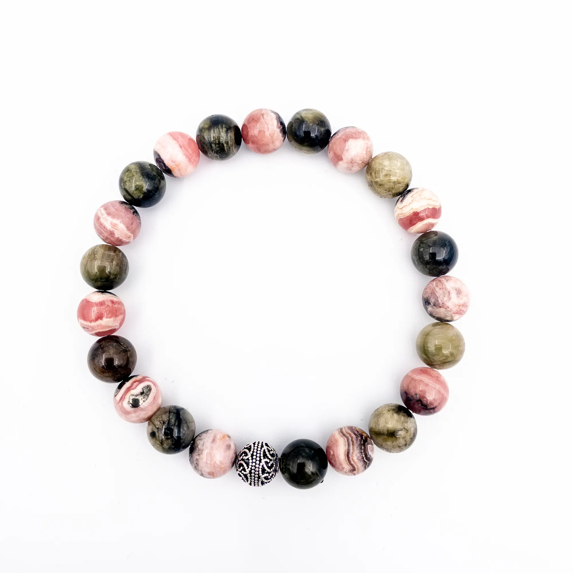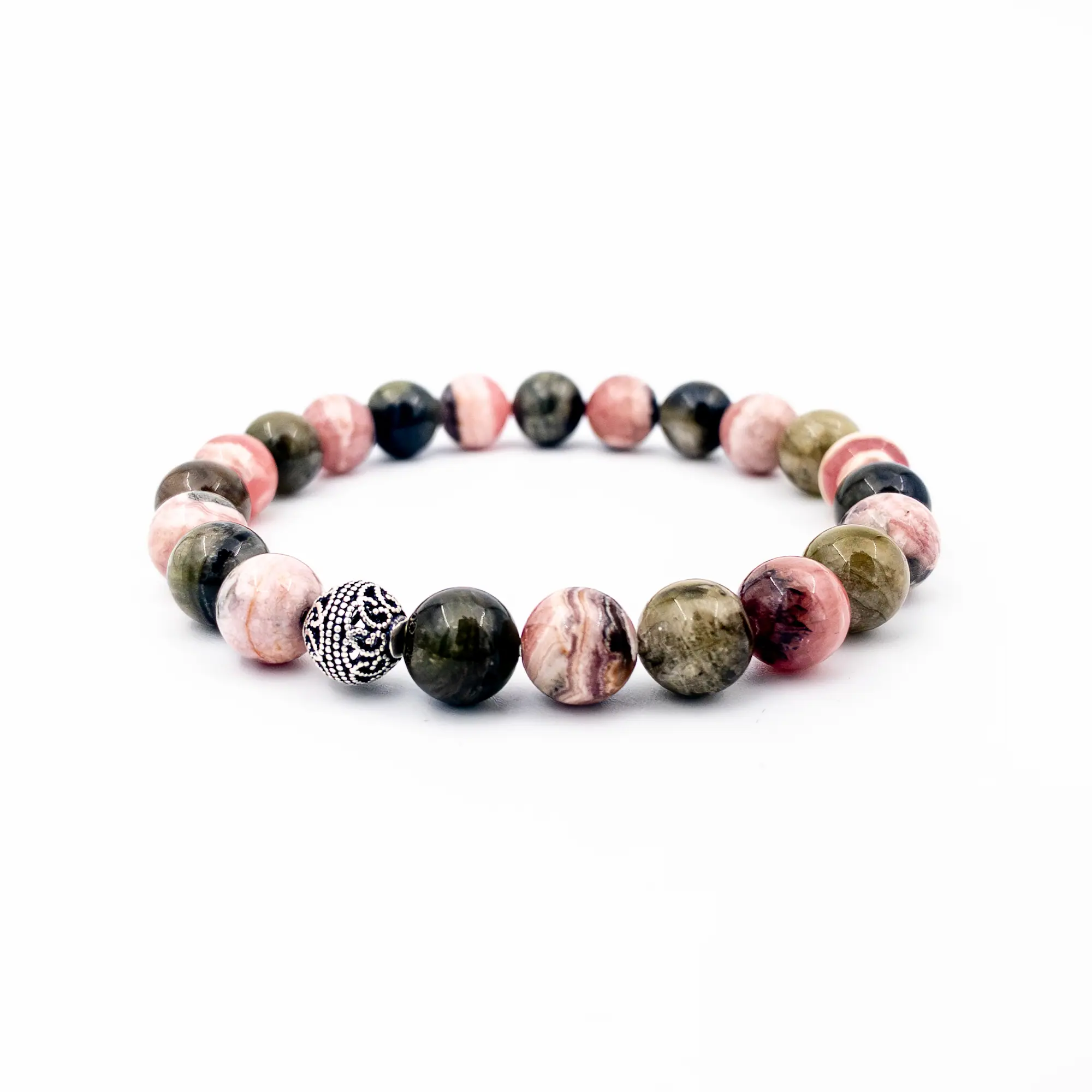Ana Materyal: %100 Doğal Rodokrozit ve Yeşil Turmalin Taşı (8 mm küre kesim)