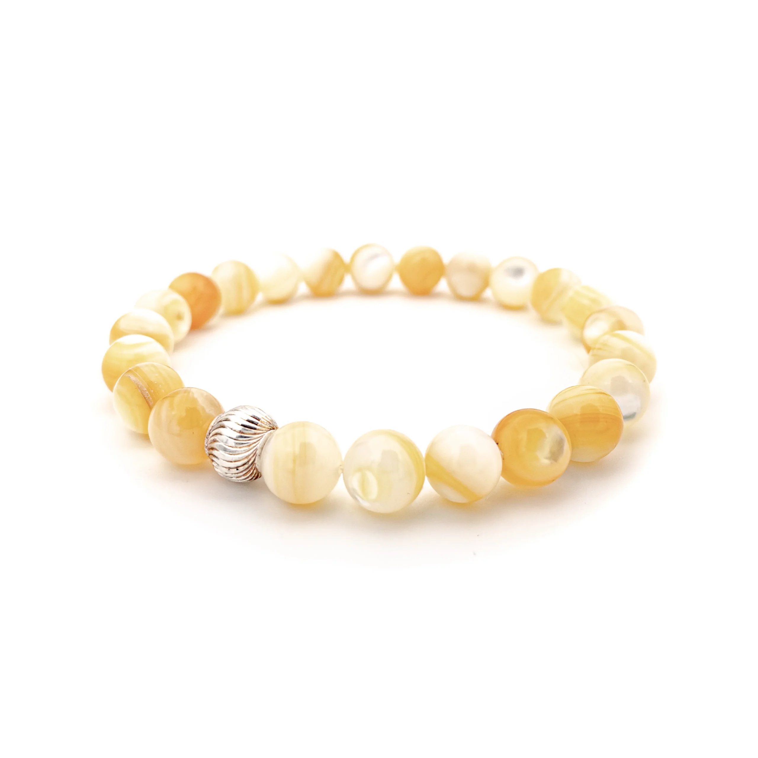8 mm ölçüsündeki taşlar, tasarımı tamamlayan 925 ayar gümüş dokunuş ile yüksek dayanımlı esnek ip üzerine dizilerek bileğinize özel hazırlanır.